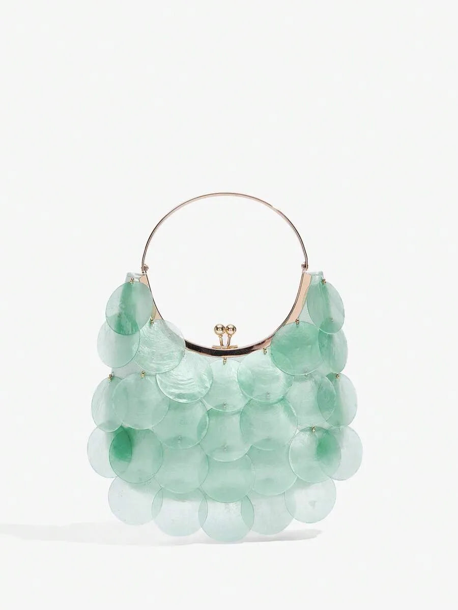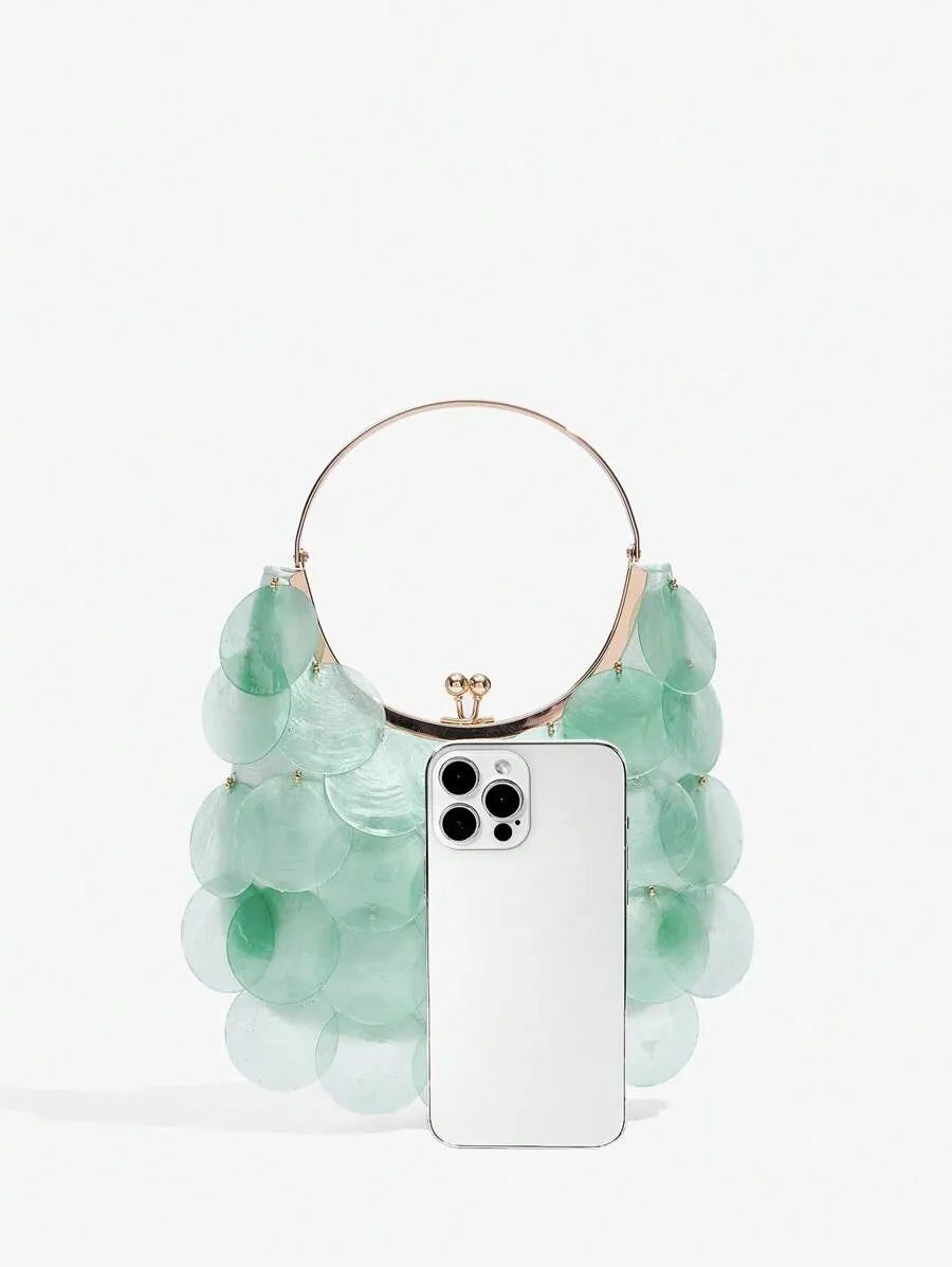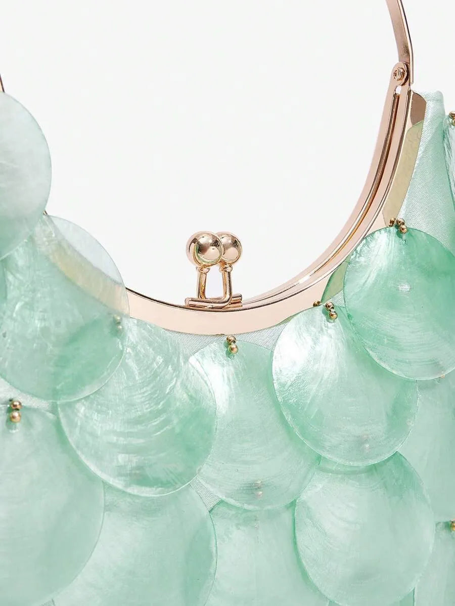 This small, colorful top handle bag features a distinctive metal shell decoration, blending fashion with function effortlessly. Crafted from durable 100% polyester, it offers versatile use for casual, beach, or holiday occasions. The kiss lock closure ensures secure access while its mint green hue adds a fresh, elegant touch. Ideal for those seeking a unique accessory that enhances any outfit with style and practicality.