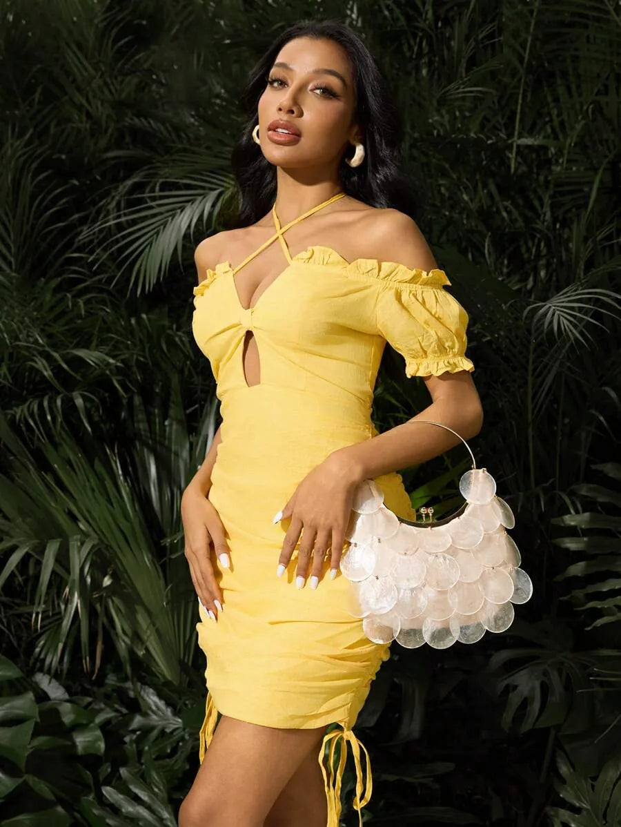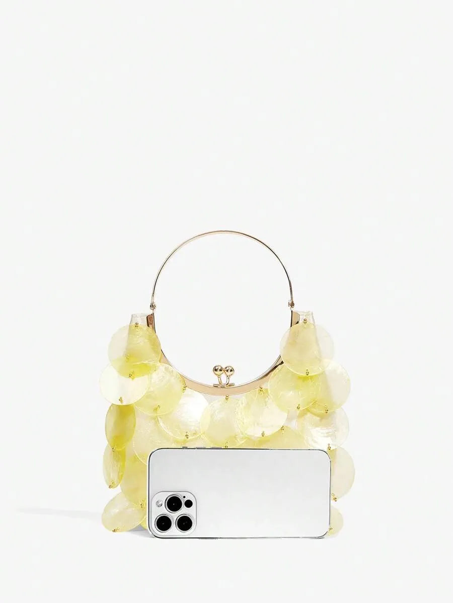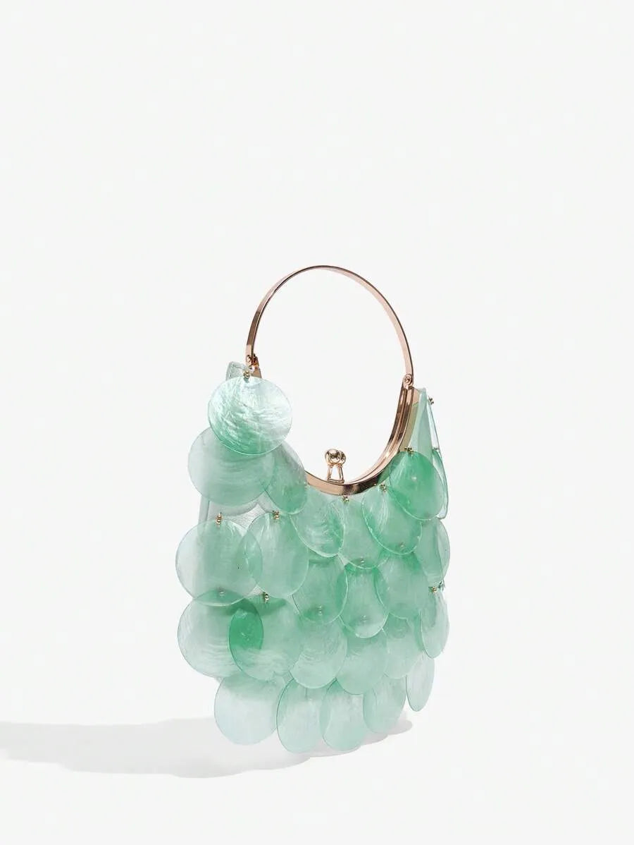 This small, colorful top handle bag features a distinctive metal shell decoration, blending fashion with function effortlessly. Crafted from durable 100% polyester, it offers versatile use for casual, beach, or holiday occasions. The kiss lock closure ensures secure access while its mint green hue adds a fresh, elegant touch. Ideal for those seeking a unique accessory that enhances any outfit with style and practicality.